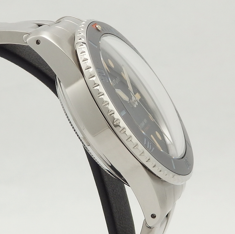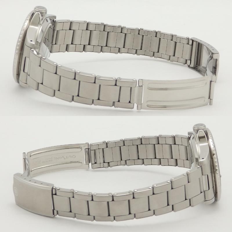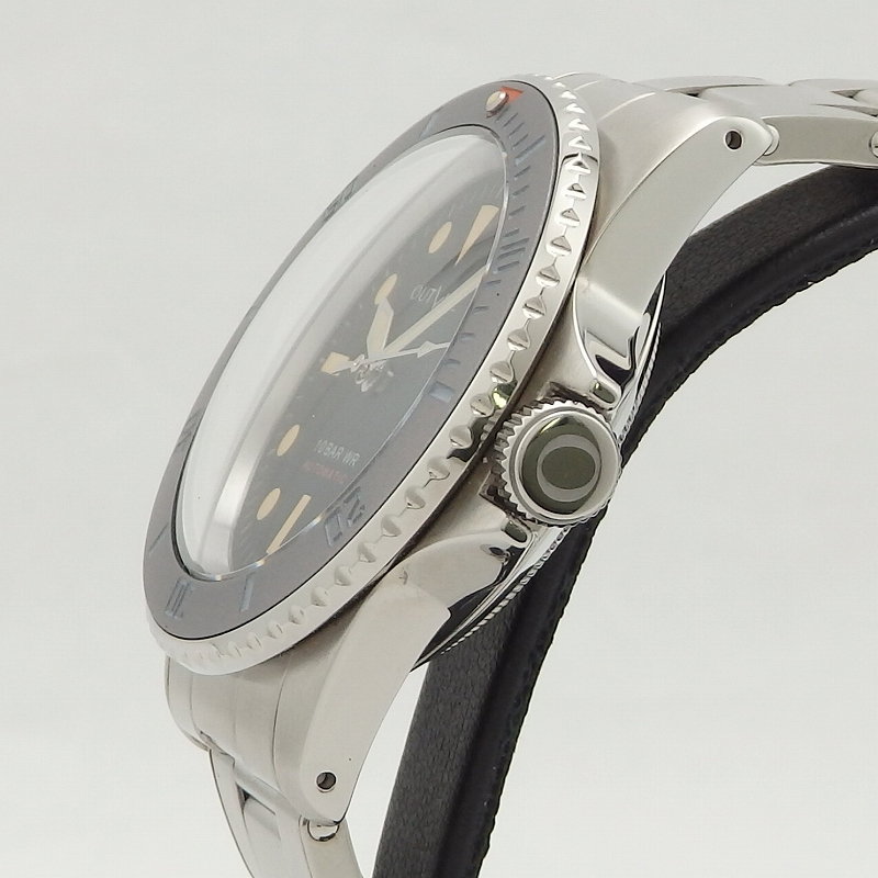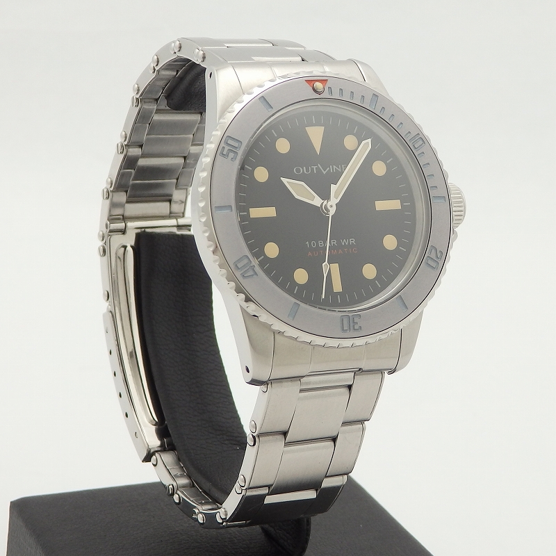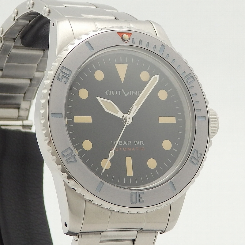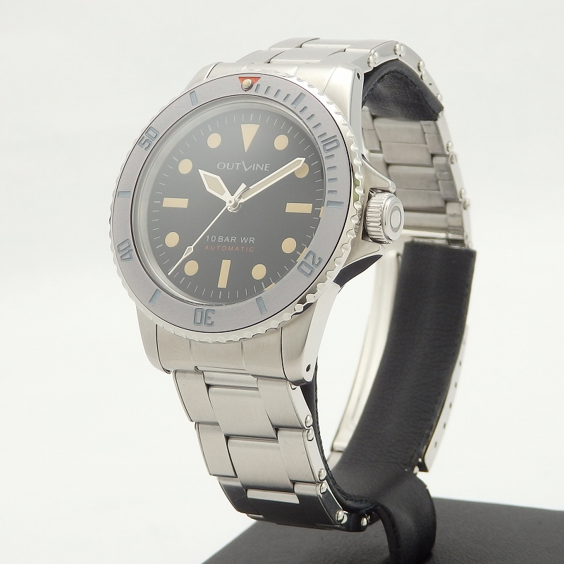 時計雑誌を手がける菊野氏が立ち上げたブランド「アウトライン」1940~1960年代の傑作モデルをモチーフにして作られ今回ダイバーズの第3弾モデル「グレーダイバー」が入荷、褐色ベゼルを再現した色合い、文字盤はマット仕上げ、ブレスレットはリベットのエクステンションブレスレットを採用したのが特徴、使用感も少なく当店にて点検済みの良いお品物です。