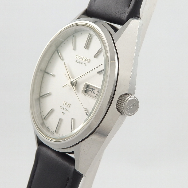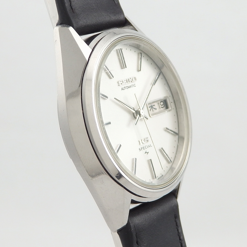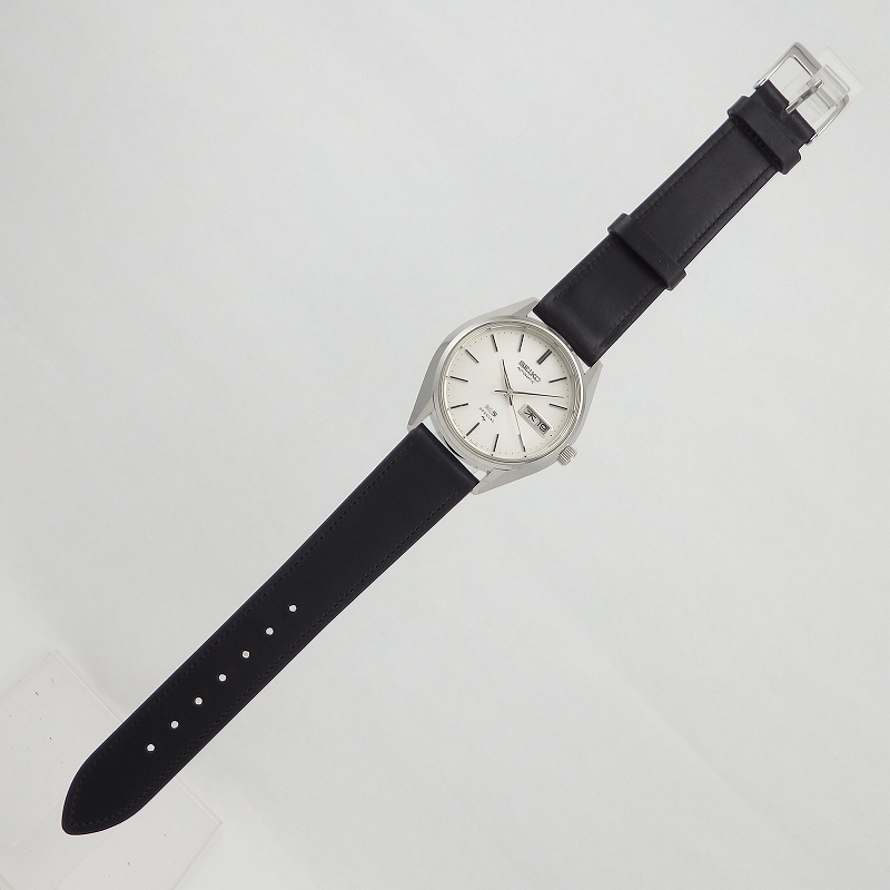 1975年の製造モデル、自動巻きキングセイコーの最終期で高精度のムーブメントを搭載した「キングセイコー スペシャル」36mmケースにシルバー文字盤とシンプルなデザインの時計、曜日と日付があるデイデイト仕様、風防はSEIKOが採用しているハードレックスのガラスで表面にキズはありますが使用上問題ない当店にて革ベルト交換・オーバーホール済みのお品物です。