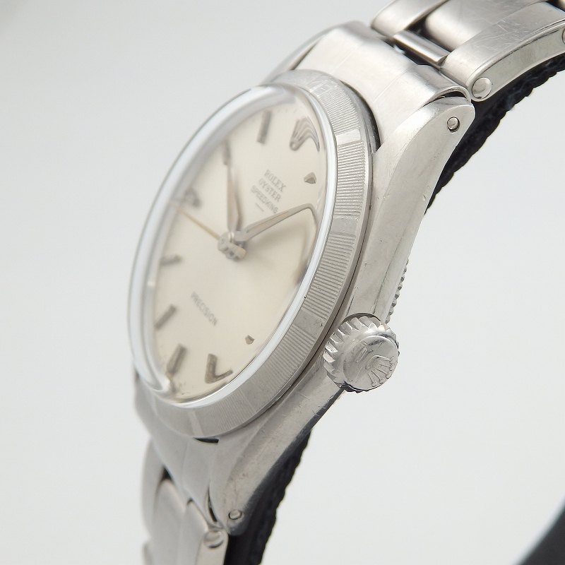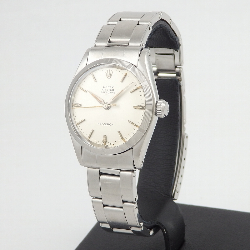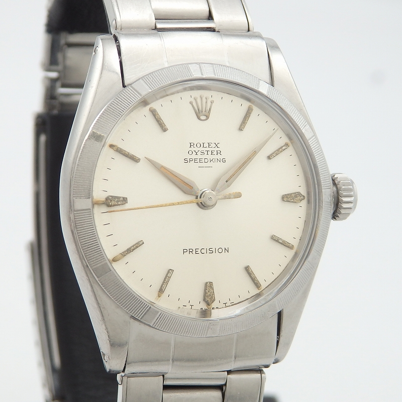 1960年代前半に製造された「オイスター スピードキング」ボーイズサイズのエンジンターンドベゼル、手巻きモデル。ブレスレットは2/64 FF62 希少なリベットブレスは長さ約17.5cmあり、ヨレも少なく引き締まった良好なコンディションです。