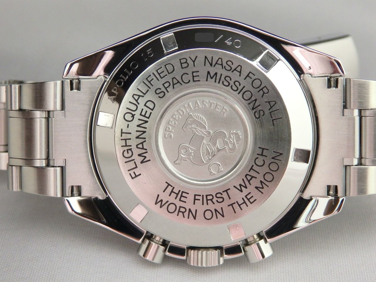 この限定セットがあまりに入手困難で人気を博したために、翌年には 「各150本ずつ」 1本売りの限定モデルとして再販売しましたが、こちらは初回生産分の「40セットのみ限定販売された分ですので、【APOLLO15 ・ **/40】という刻印が裏蓋に彫られています。
