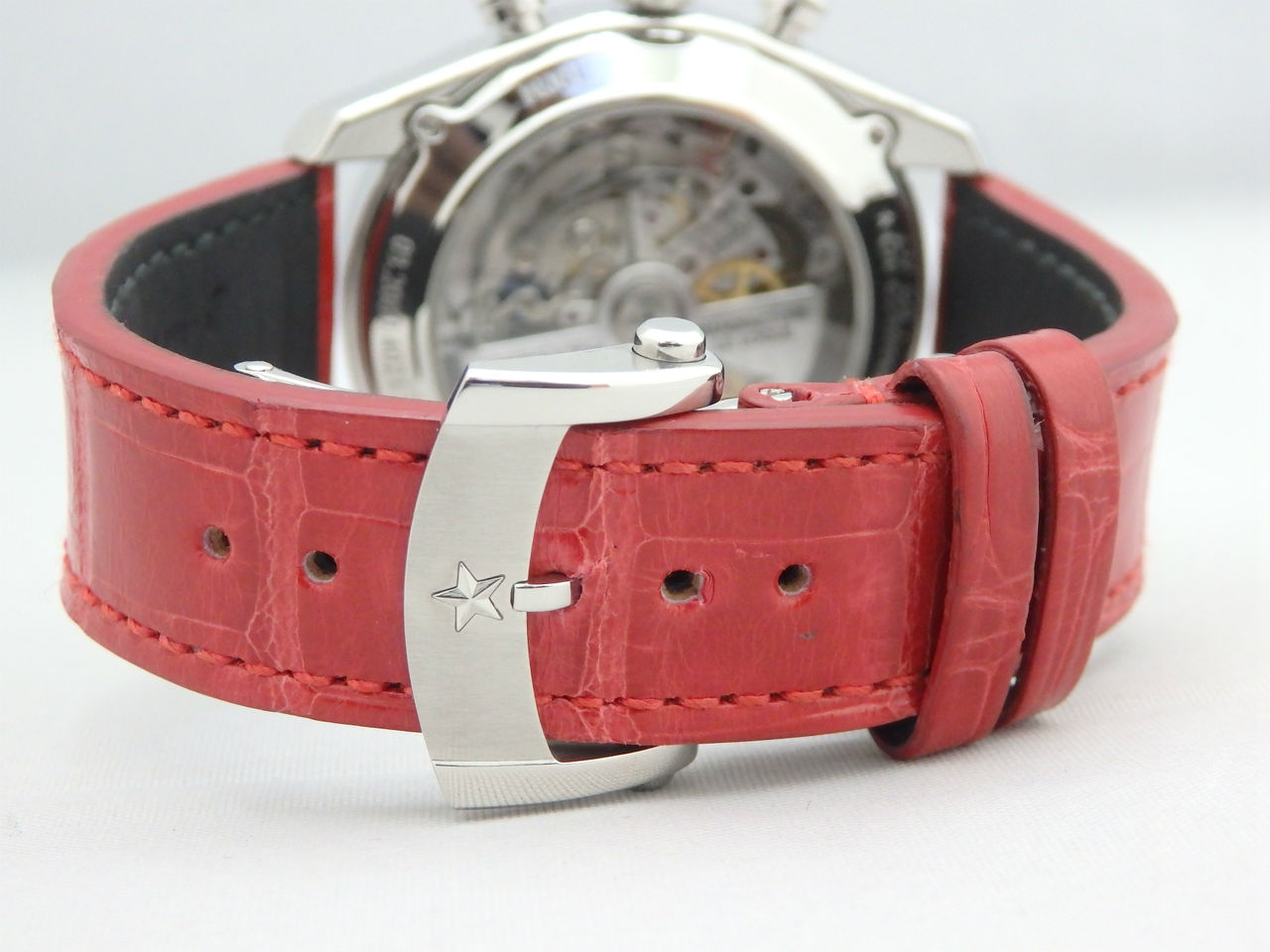 革ベルトは純正の赤クロコでサイズが短めになっています17.5cm程まで対応できます。