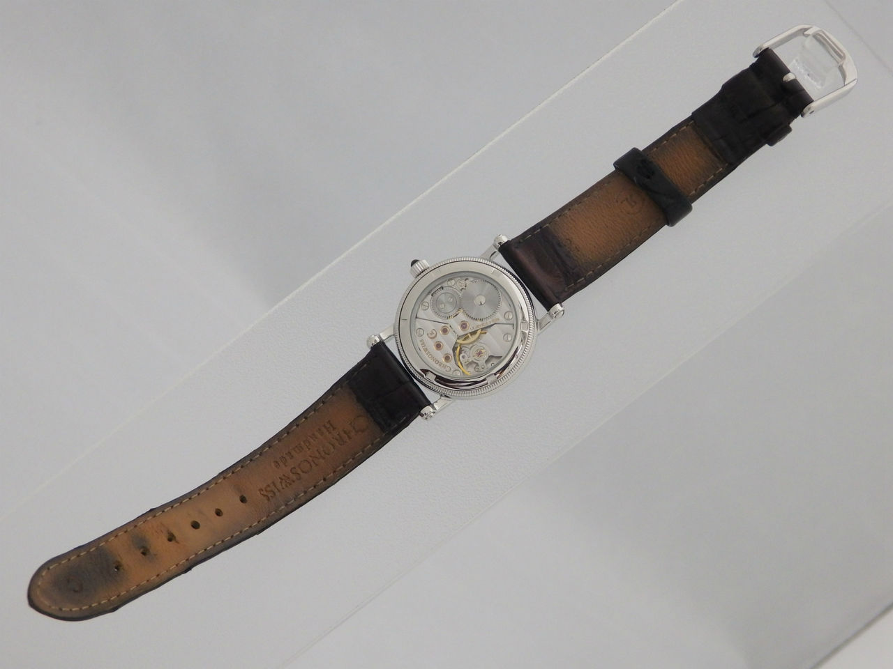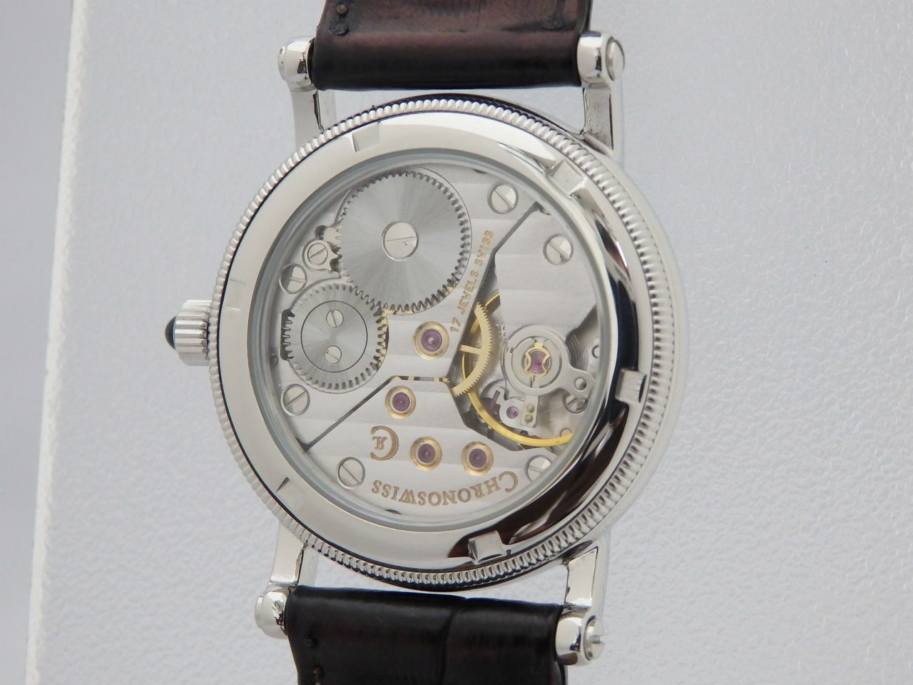 美しい手巻きムーブメントは機械式時計の良さを十分に味わえます。