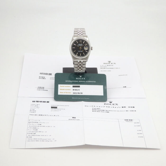 ロレックス デイトジャスト 1603 メンズ ブラック文字盤 メーカー修理明細書付 入荷しました!
