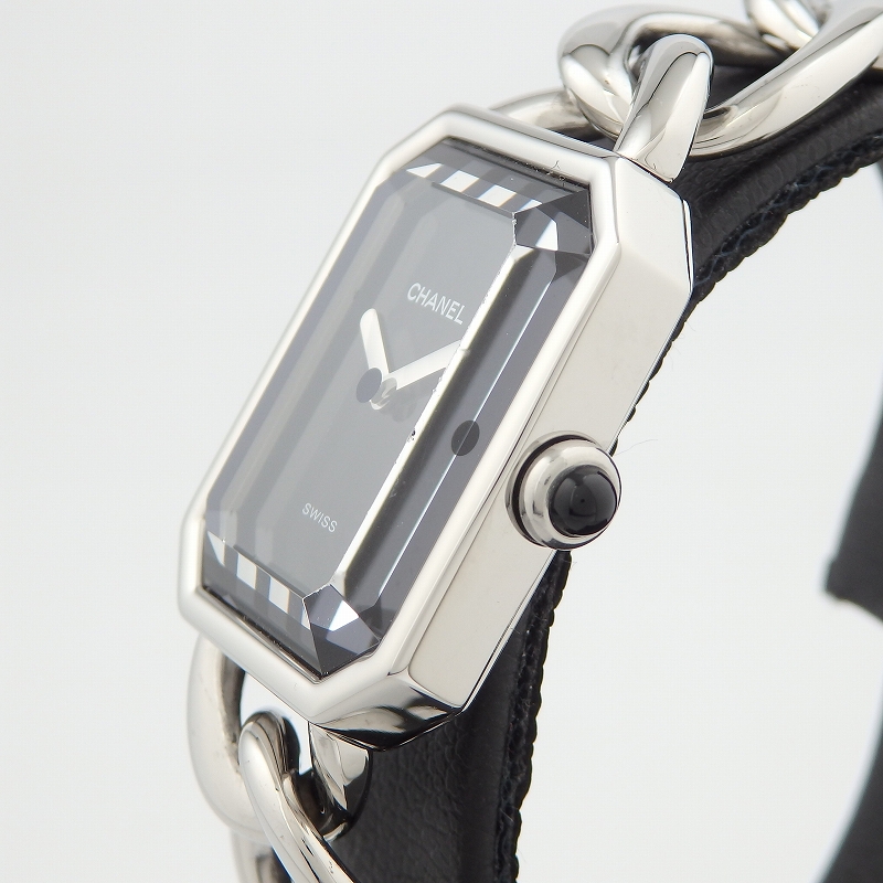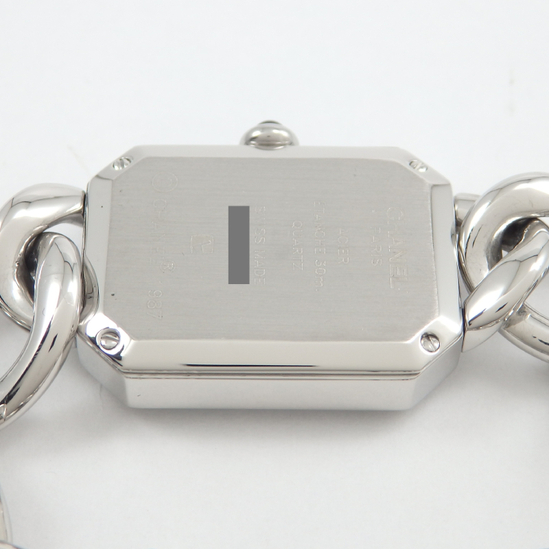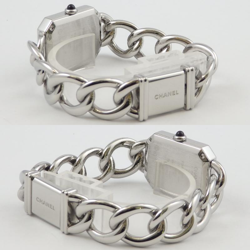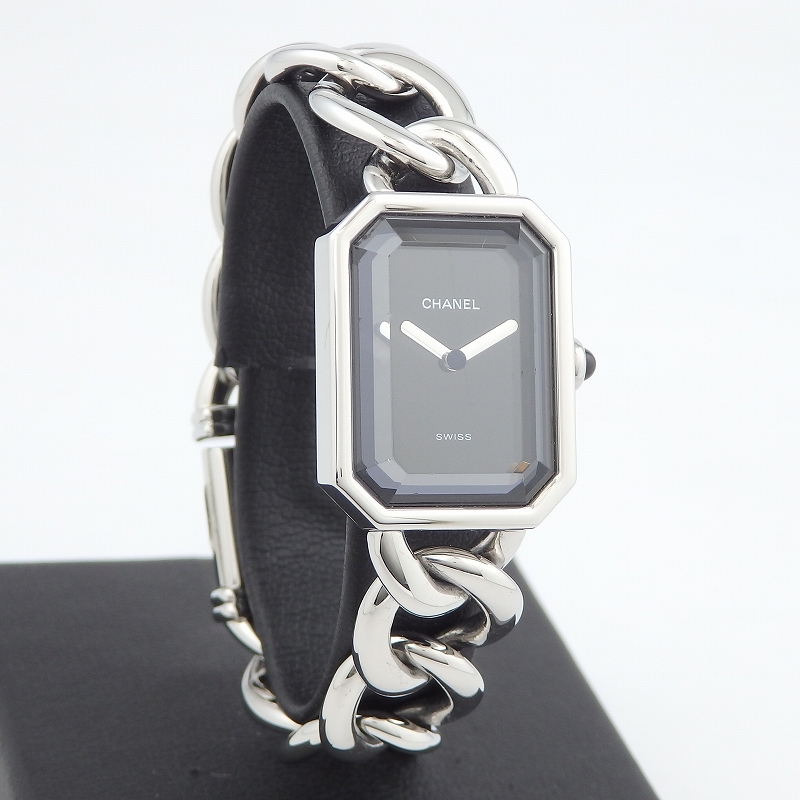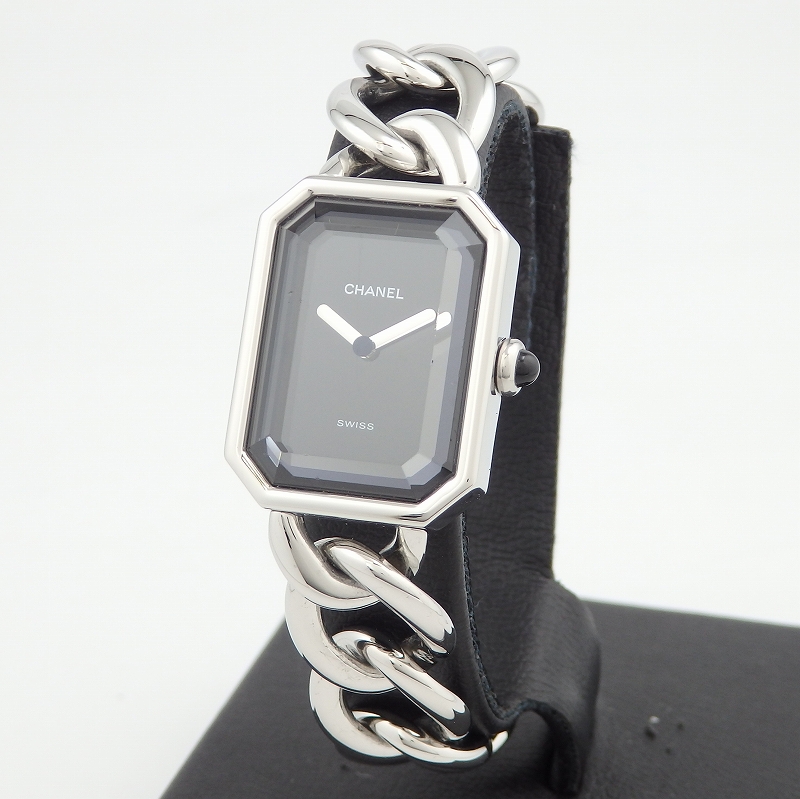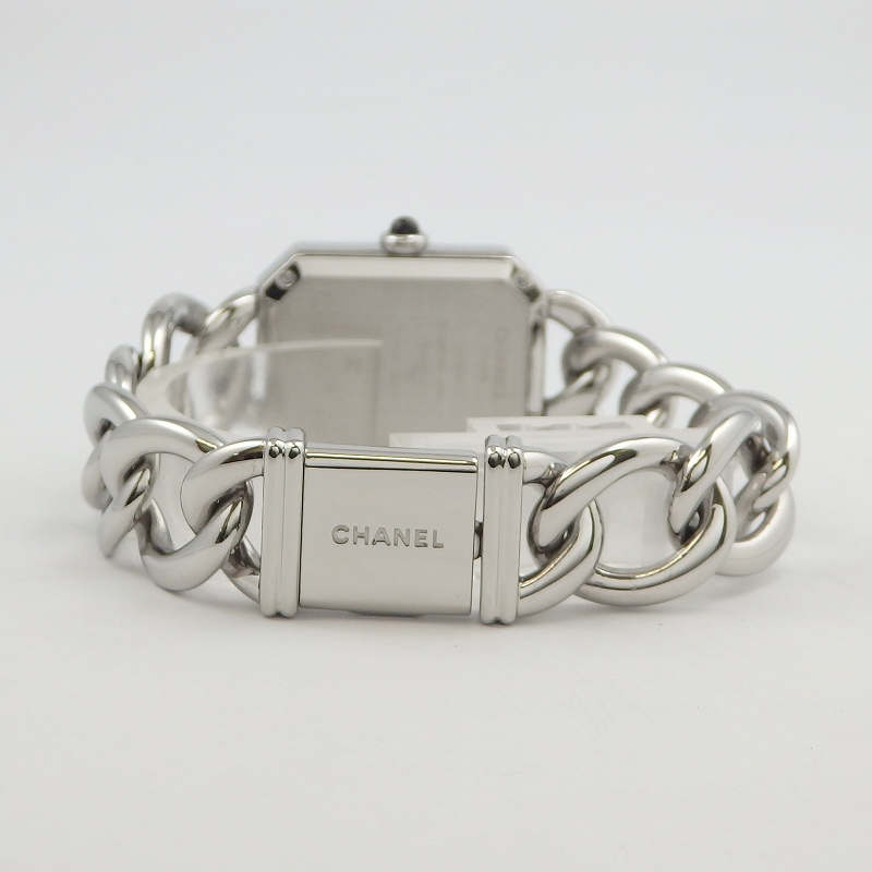 シャネル初の腕時計として発売された「プルミエール」ステンレススチールは1997年に発表されてから根強い人気のモデル、8角形のケースとチェーンのブレスが特徴でブレスレット感覚としても身に着けられます。サイズはMサイズでガラスに若干キズはありますが使用上は問題ありません。