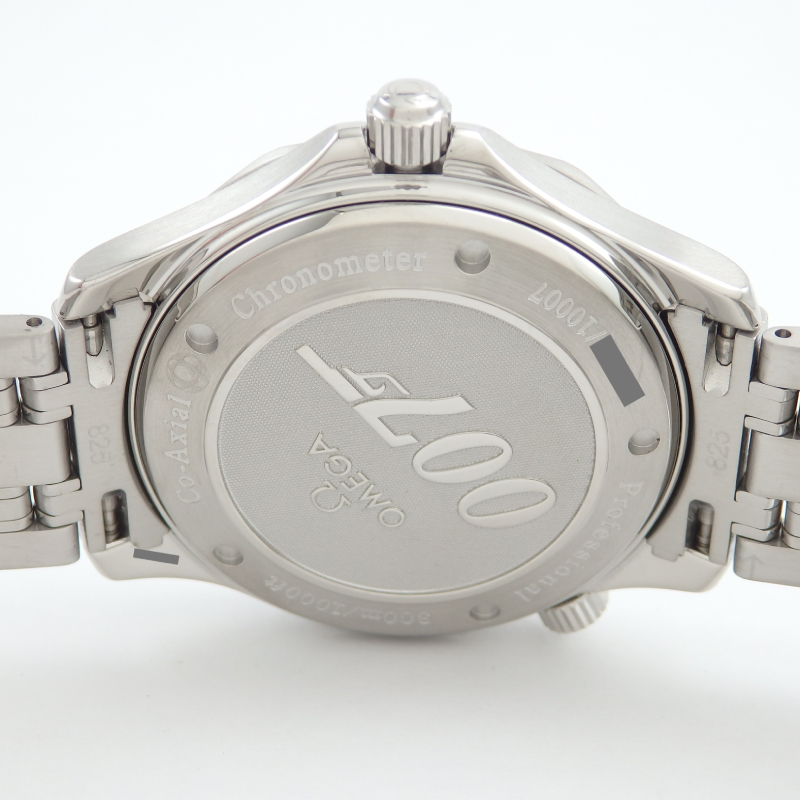 2006年発売で世界限定10007本の「シーマスター007ジェームスボンド」文字盤は銃口をモチーフにしたブルー文字盤、秒針と裏蓋・クラスプに007のロゴが入っているが特徴でムーブメントは初期のコーアクシャルCal.2500を搭載、アンクルの爪石を3つにし部品の摩耗を緩和し耐久性が上がったムーブメント。
